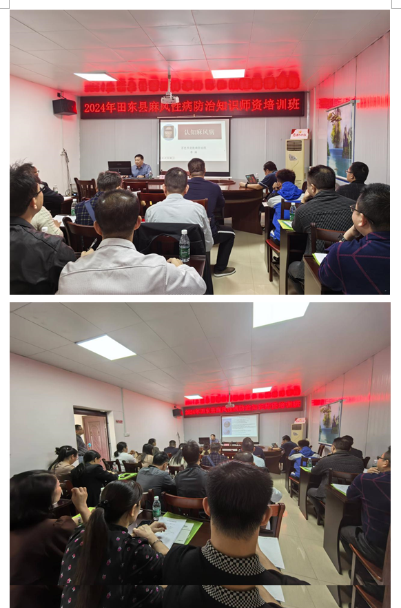 为进一步发挥医联体医共体牵头医院作用,推动优质医疗资源下沉,推进麻风性病防治工作发展,提升县级医疗机构两病防治工作服务能力,2024年11月21日我院李海副院长受田东县皮肤病防治站的邀请,赴田东县进行麻风性病防治知识培训,田东县皮肤病防治站门诊、麻防科医生,县级其他医疗单位皮肤性病科科长及乡镇卫生院副院长、防疫组组长共50余人参加培训。
