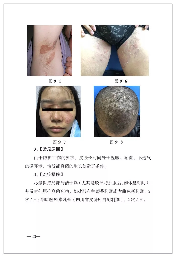 医务工作者是这场疫情防控战役的主攻力量,尤其是奋战在防控一线的医务工作者,由于长时间使用防护服、橡胶手套、防护口罩、眼罩、防水鞋等隔离装备,由此造成的皮肤损伤及次生损害问题,已成为影响战斗力的一个重要因素。同时,医护人员脱离防护装备后,新型冠状病毒(2019-nCoV)可通过接触传播,皮肤损伤极易为病毒入侵创造条件等问题,也必须引起高度重视。为了有效保护防疫一线医护人员,我们依据皮肤病学专业特点,按照防疫急需、实用简捷的原则,从皮肤损伤的症状表现入手,组织编写了《医用防护装备易引起的皮肤损伤及处置措施》,谨献给全力战斗在防疫一线的各专业同仁们,以期为疫情防控成功贡献一份绵薄之力。由于时间仓促,有不当之处,敬请批评指正。